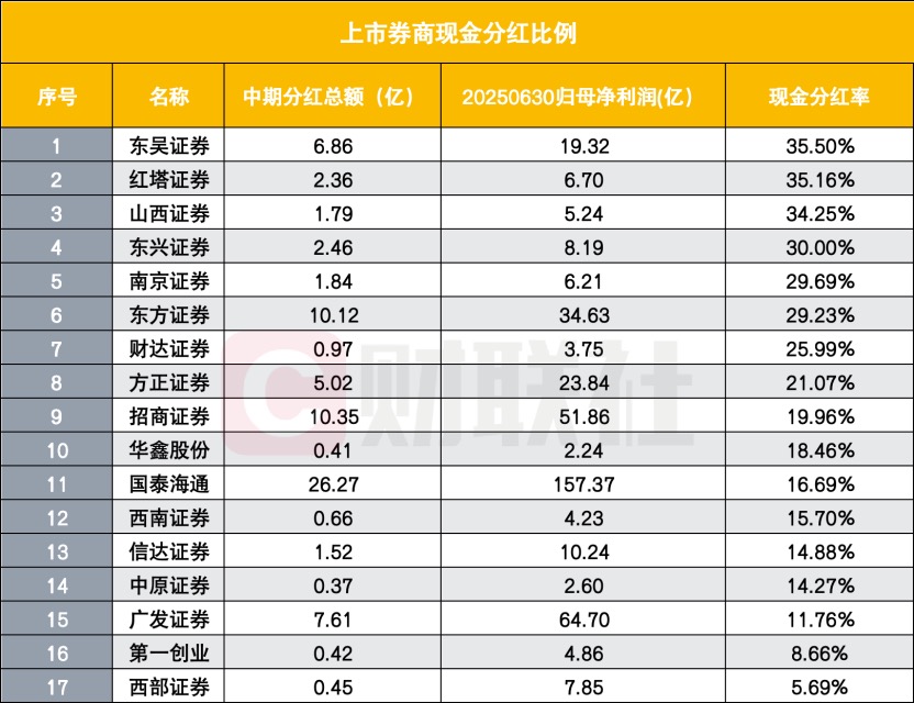 现金分红率角度来看,17家券商中,东吴证券以35.50%的分红率登顶,成为今年年中分红的“最大黑马”。其6.86亿元的中期分红总额,对应19.32亿元的中期归母净利润,每100元净利润中有35.5元用于回馈股东。