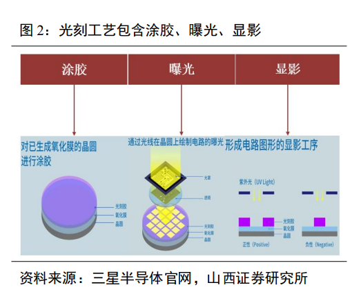 另据山西证券研报,光刻的工艺又细分为涂胶、曝光、显影。涂胶,在晶圆表面均匀涂抹对光敏感的物质——光刻胶(PR,Photo Resist);曝光,使用曝光设备(光刻机)使光穿过包含电路图形的光罩,将电路印在晶圆上;显影,在晶圆上喷洒显影液后,选择性的去除曝光区和非曝光区,从而形成电路图形。