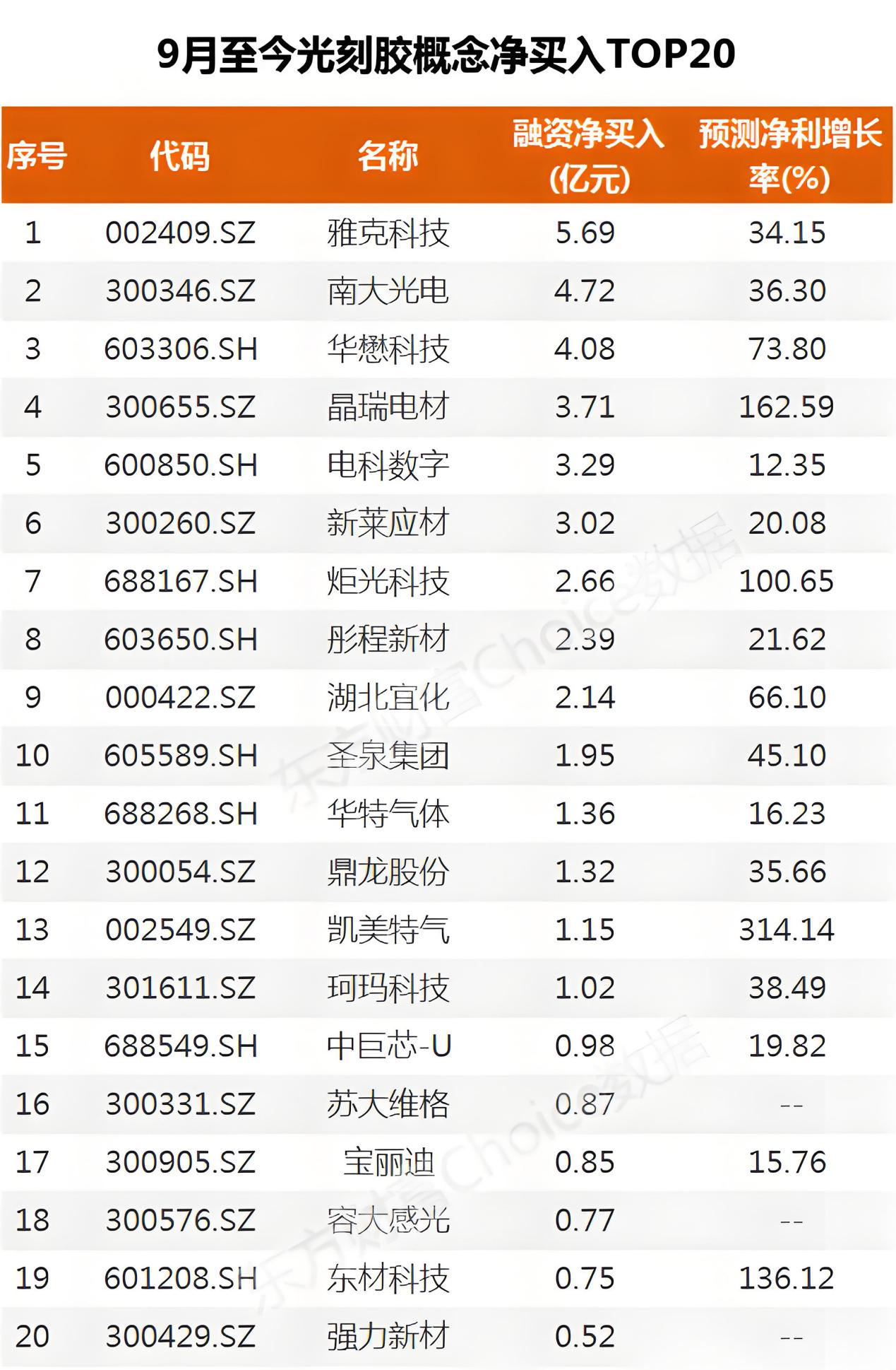 东方财富Choice数据显示,自今年9月以来,杠杆资金持续抢筹光刻胶概念多股。其中雅克科技排名第一,期间融资净买额超5亿元;南大光电排名第二,融资净买额超4.7亿元。