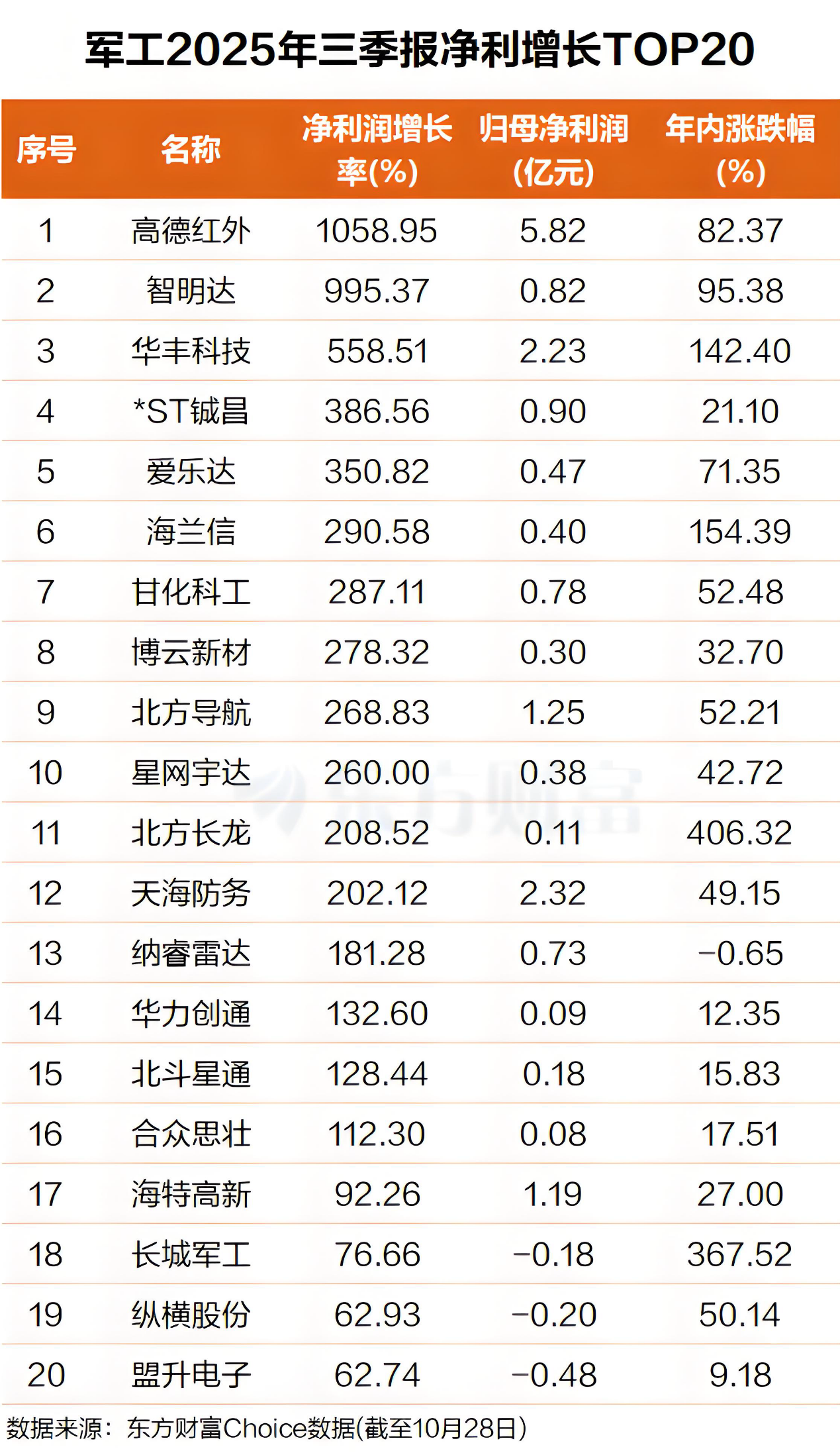 具体来看,截至10月28日收盘,从三季报净利润增长角度看,高德红外位列第一,净利润增长接近11倍,该股年内累计涨幅超82%;智明达排名第二,净利润增长接近10倍,年内涨幅超95%。