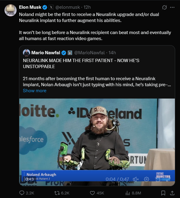 对此,马斯克表示:“诺兰可能是首个接受Neuralink升级,并且可能将会是首个为了提升自身能力,而植入双Neuralink设备的人。”他强调,在不久的将来,Neuralink脑机接口的植入者就能在快节奏的电子游戏中击败大多数甚至所有人类。