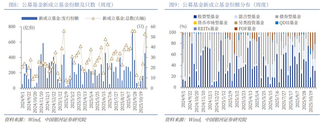 按基金成立日统计,本周新成立基金53只,发行份额为455.20亿份。其中,权益类基金(包括股票型基金和混合型基金)共有38只,发行份额235.96亿份,较上周上升153.57亿份,本周份额占比51.84%,较上周上升0.65个百分点。