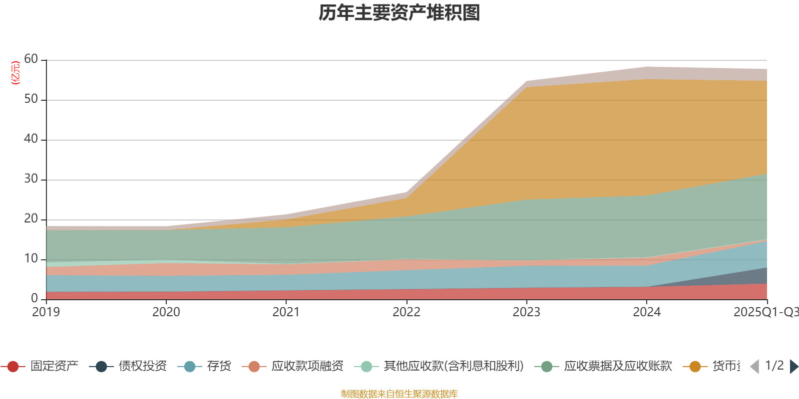 资产重大变化方面,截至2025年三季度末,公司货币资金较上年末减少19.96%,占公司总资产比重下降9.57个百分点;债权投资占公司总资产的6.99%,上年末为0;应收款项融资较上年末减少80.64%,占公司总资产比重下降2.71个百分点;存货较上年末增加23.53%,占公司总资产比重上升2.27个百分点。