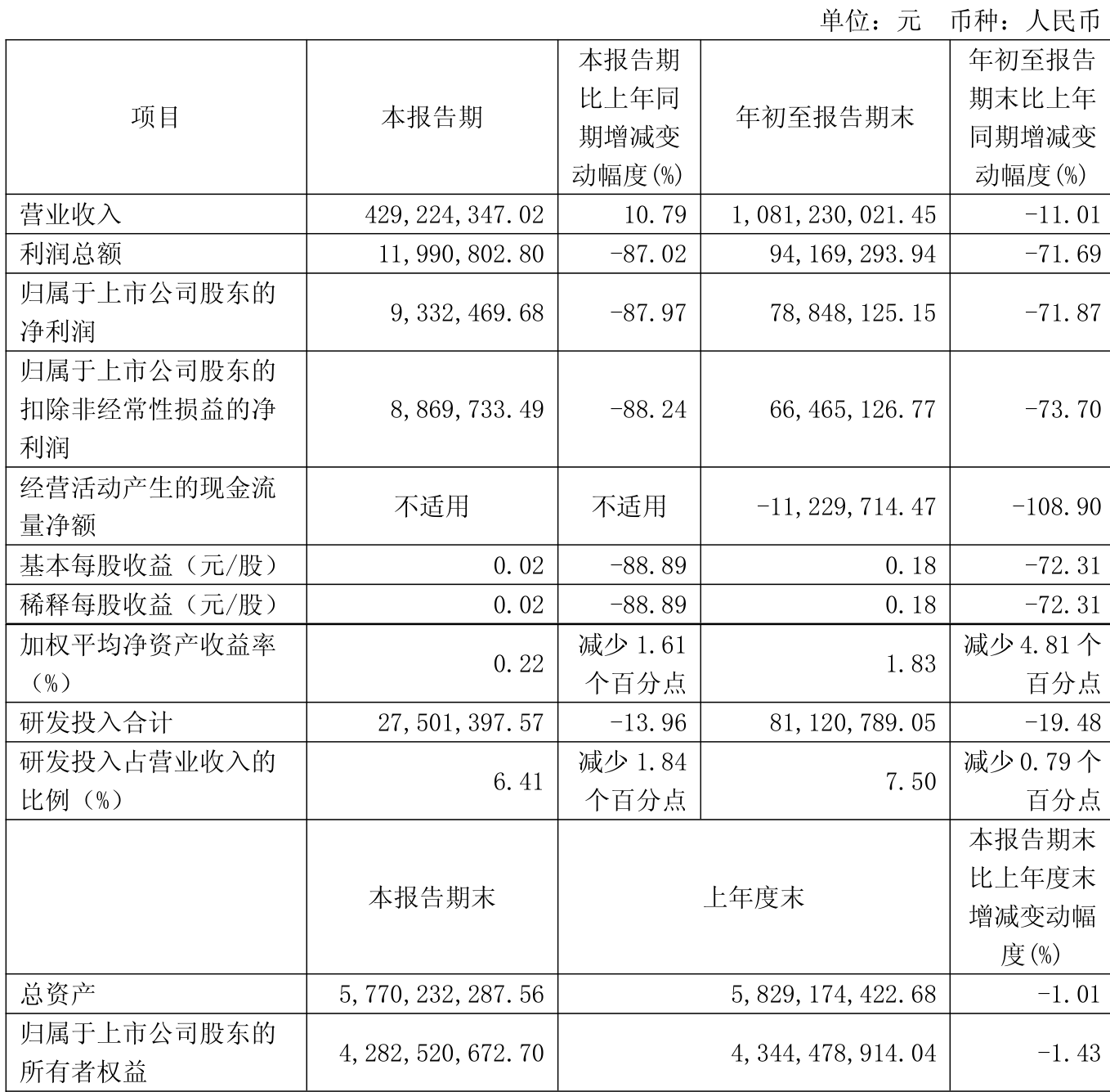 2025年前三季度,公司经营活动现金流净额为-1122.97万元,同比减少1.37亿元;筹资活动现金流净额-1.45亿元,同比增加2965.36万元;投资活动现金流净额-4.26亿元,上年同期为-6276.95万元。