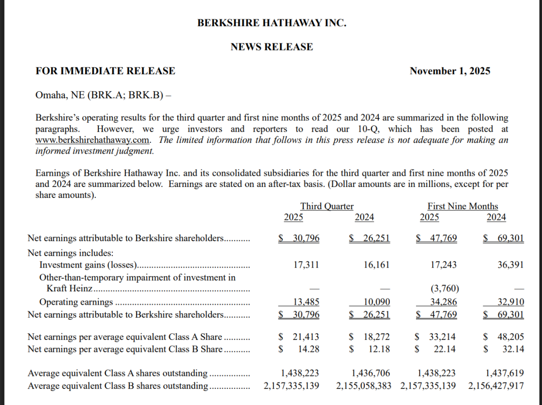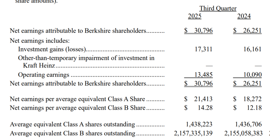 第三季度伯克希尔录得净利润307.96亿美元,折合每股A类等价收益21413美元;上年同期净利润为262.51亿美元,每股18,272美元。