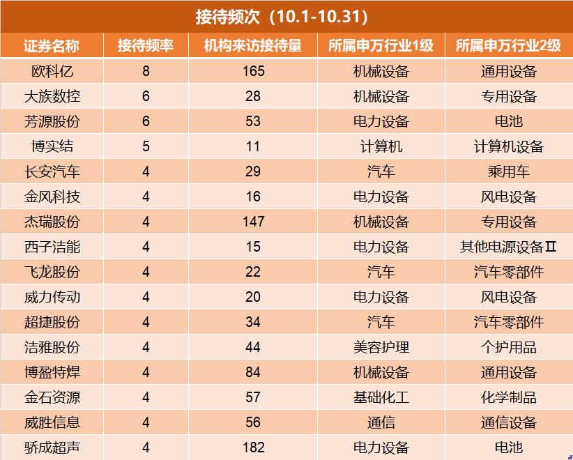 据Choice数据统计,沪深京三市10月(10.1-10.31)共有957家上市公司接受机构调研。具体来看,接待机构调研次数最多的上市公司是欧科亿,达8次;大族数控和芳源股份位列第二,接待次数为6次;博实结紧随其后,接待次数为5次。具体详见下图:
