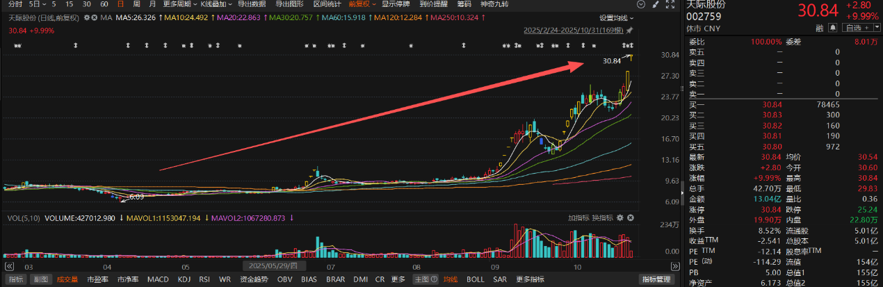 锂电池概念股天际股份周五收盘录得两连板,公司股价自4月9日低点迄今累计最大涨幅达466%。天际股份10月31日发布机构调研纪要表示,公司2025年三季度六氟磷酸锂的销售均价比较低,导致亏损,但趋势来看,销售均价一直在提升,没有签长协合同的价格有明显的上涨,经营层面满产满销,目前库存降至极低位置。产能方面,现在一个月三千多吨,预计今年出货量在3.5-3.8万,明年25%的市场增长对应明年出货量超过5万吨,募投项目1.5万吨产能预计今年年底做设备定制和安装,明年大概率可以做到很满的状态。