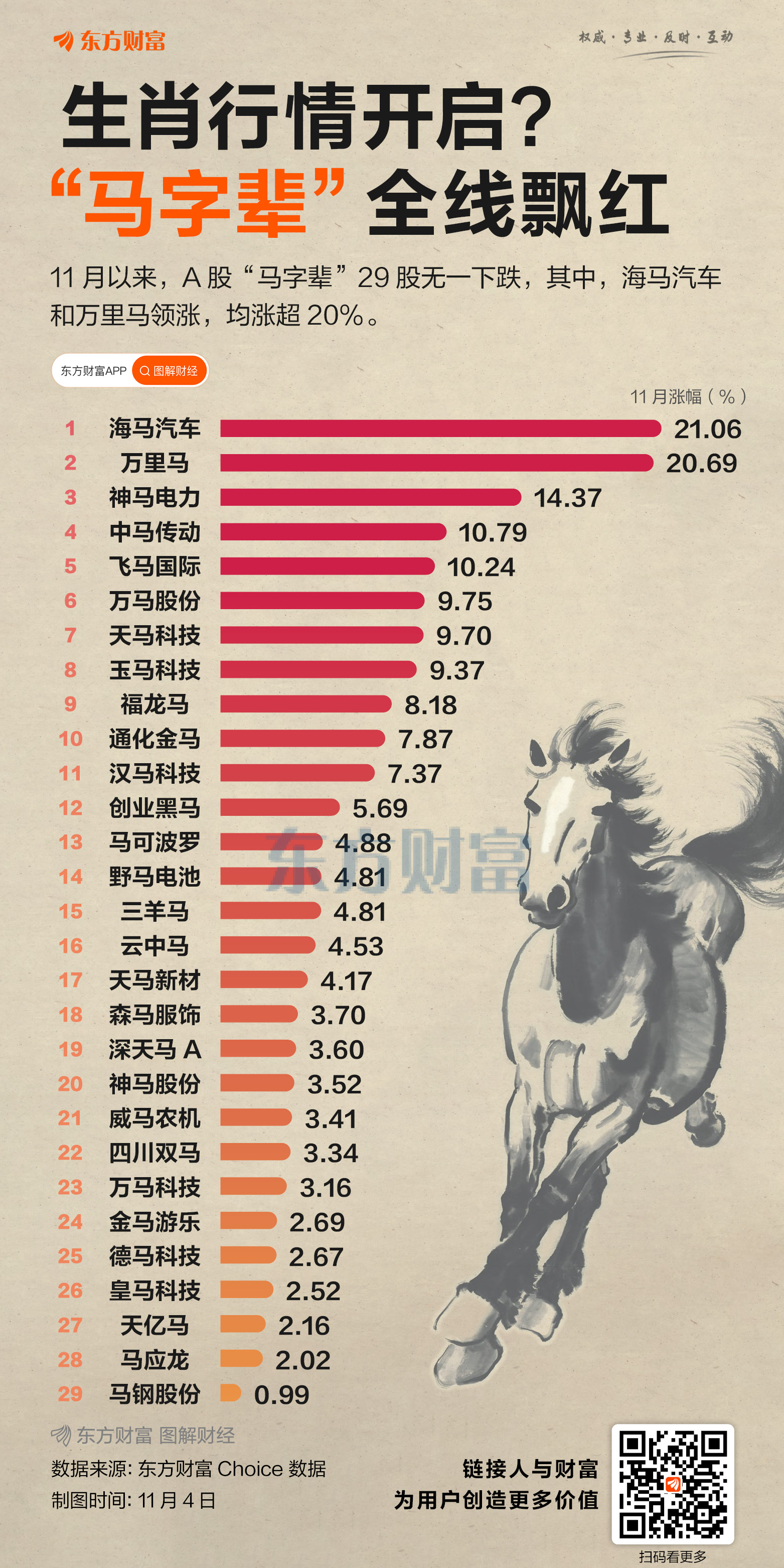 据东方财富Choice数据,2026年是农历马年,A股证券简称中带有“马”字的股票共计29只,进入11月后的两个交易日里,“马字辈”全线飘红,无一下跌。其中,海马汽车领涨,连续两日涨停下累计涨幅达21.06%;万里马紧随其后,累计涨幅达20.69%。