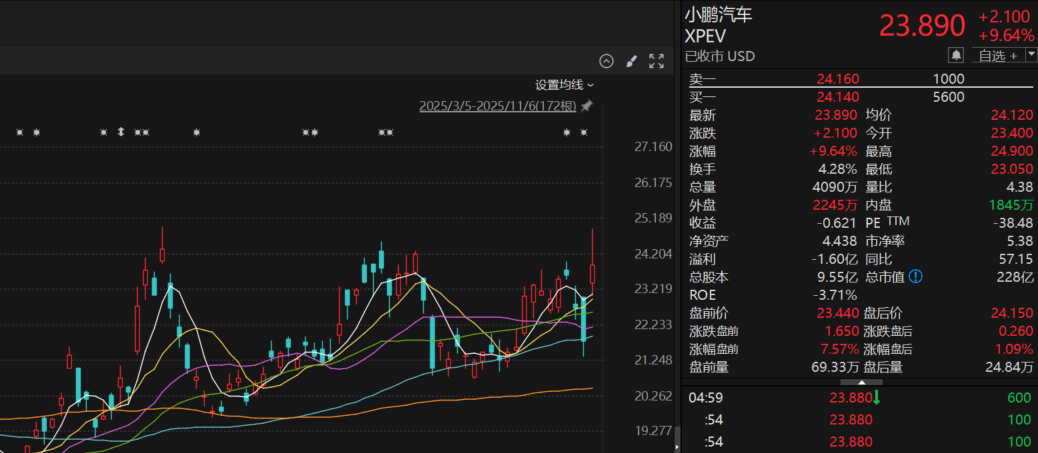 在何小鹏的两度自证下,资本市场给小鹏汽车投下了信任票。昨夜今晨,小鹏汽车美股开盘后大涨,盘中一度涨超14%,截至收盘涨9.64%,报23.89美元,总市值228亿美元。