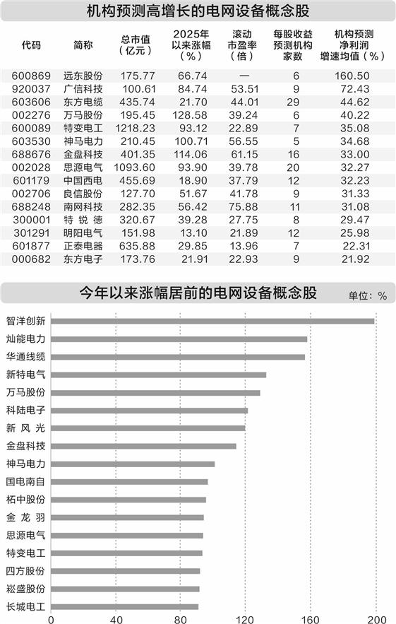 据证券时报·数据宝统计,今年以来,电网设备概念股平均上涨42.9%,年内涨幅翻倍的概念股有9只。具体来看,智洋创新、灿能电力、华通线缆、新特电气和万马股份涨幅排在前五位。