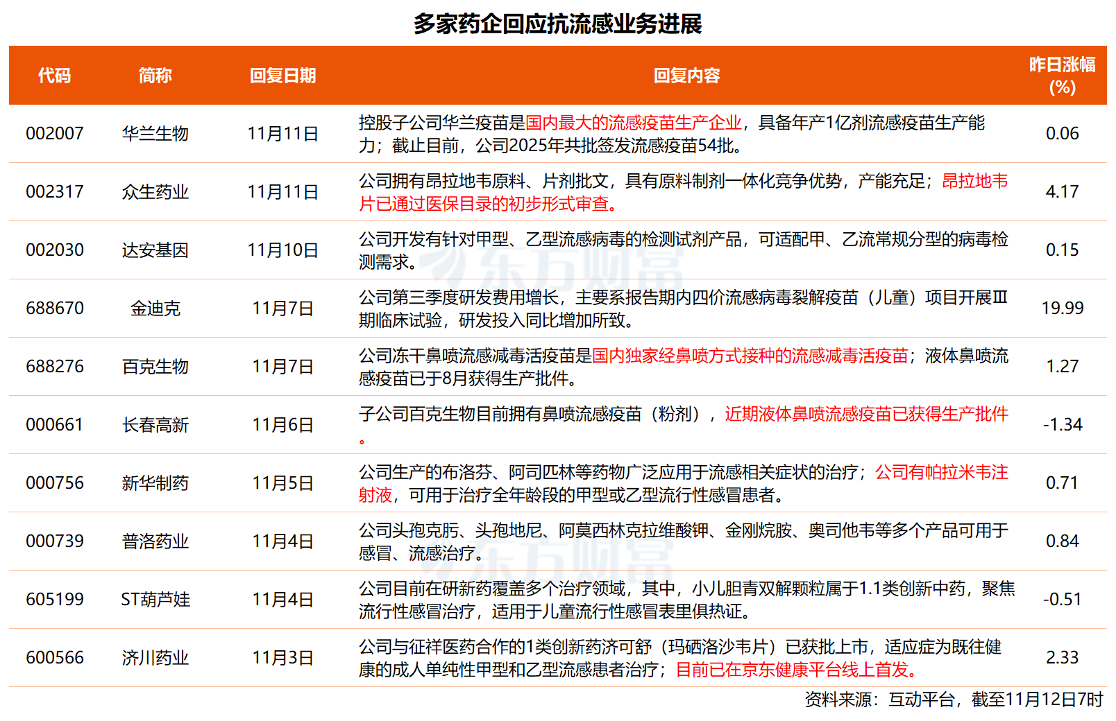据东方财富不完全统计,11月以来,已有十余家上市公司在互动平台回复“流感”相关提问,各公司主要介绍了自家产品的研发进展、产品布局、供应情况等。