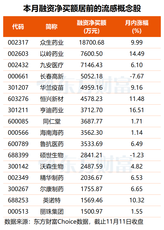 值得一提的是,东方财富Choice数据显示,11月以来,已有多只流感概念股获杠杆资金加仓。其中,众生药业月内融资净买额达1.87亿元,以岭药业、九安医疗融资净买额均超7000万元,长春高新、华兰疫苗也获融资客抢筹约5000万元。