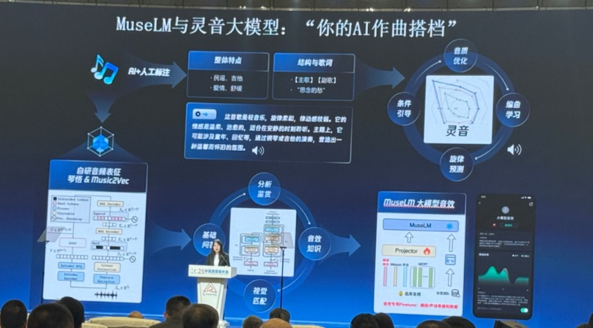 会上,一批来自腾讯、商汤科技、爱奇艺等公司的音视频AI制作垂类大模型和应用软件首发、首秀。腾讯云现场发布了“AI音频超能力”——MuseLM与灵音大模型。该模型以四大新技术全面升级音乐编辑能力,可帮助媒体工作者应对原创版权缺乏、制作效率较低、互动形态单一的音频创作挑战,逐步成为“你的AI作曲搭档”,让“一键生成高质量音频节目”的梦想照进现实。