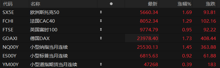 周一盘前,美股三大股指期货齐涨,欧洲主要指数普遍上涨。截至发稿,纳斯达克100指数期货涨1.45%,标普500指数期货涨0.92%,道指期货涨0.39%。