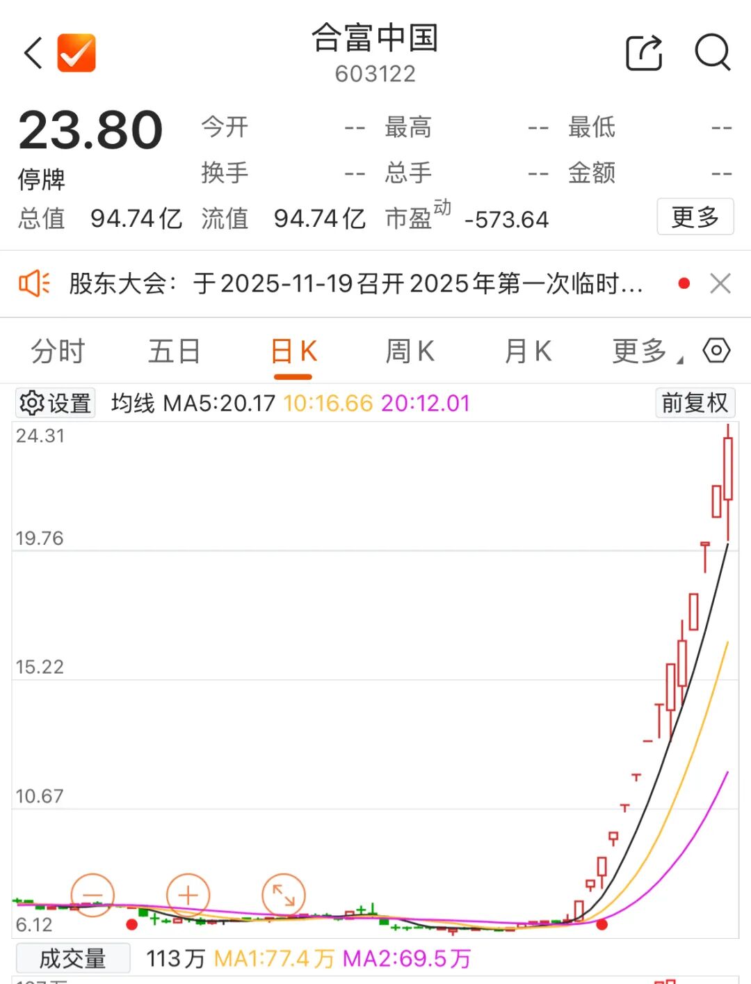 截至停牌前最后一个交易日,即11月14日,合富中国股价报23.80元/股,当天涨幅达7.69%,总市值为94.74亿元。