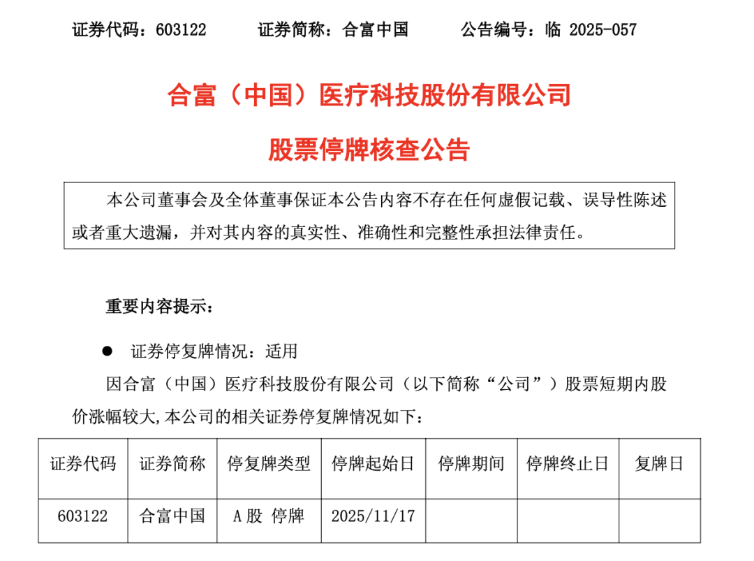11月19日盘后,合富中国(603122)发布股票交易停牌核查结果暨复牌公告,公司股票将于2025年11月20日(星期四)复牌。