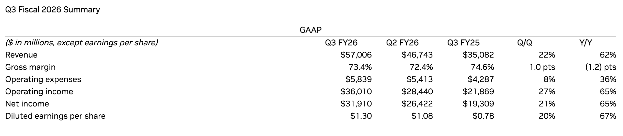 美东时间11月19日,英伟达公布了2026财年第三财季业绩。财报显示,英伟达当季营收达570.06亿美元,同比增长62%,高于预期的542亿美元;美国通用会计准则(GAAP)下净利润达319.10亿美元,同比增长65%。