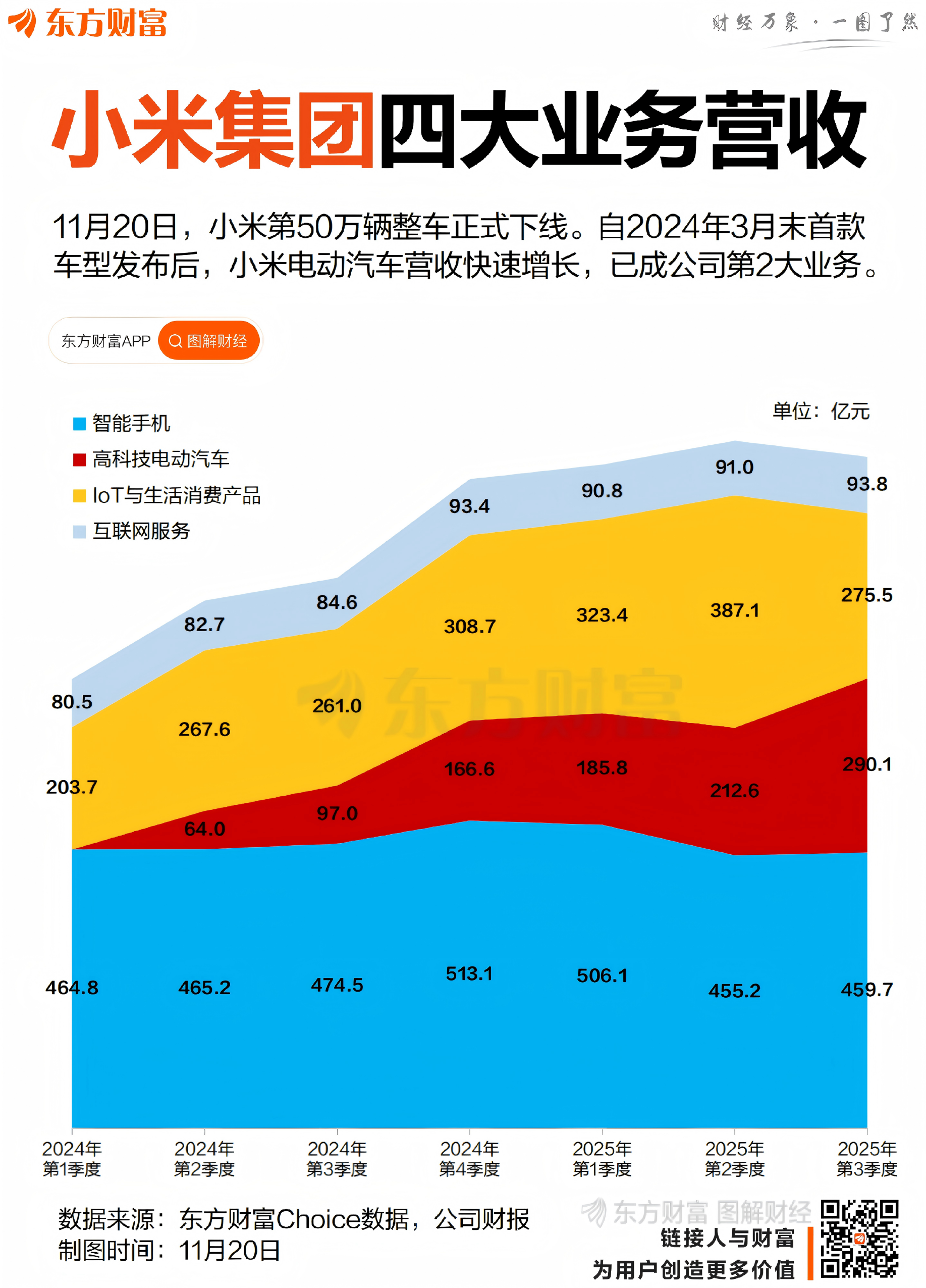 财报显示,小米集团当前有四大核心业务,分别为“智能手机”“高科技电动汽车”“IoT与生活消费产品”“互联网服务”。今年第3季度,小米汽车营收达290.1亿元,反超IoT与生活消费产品成集团第二大业务。与此同时,小米汽车从第二季度3亿元的经营亏损成功扭亏,经营收益为7亿元,平均每卖1台车净赚6434元。