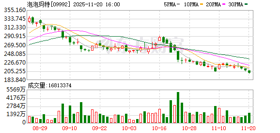 泡泡玛特股价在8月底一度接近340港元/股,11月20日收盘已跌至201.4港元/股,跌幅约40%。