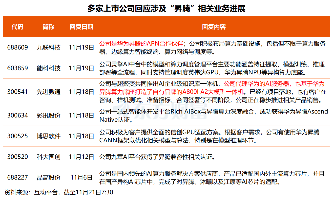 据东方财富不完全统计,近期已有多家上市公司在互动平台回应有关华为昇腾的提问。
