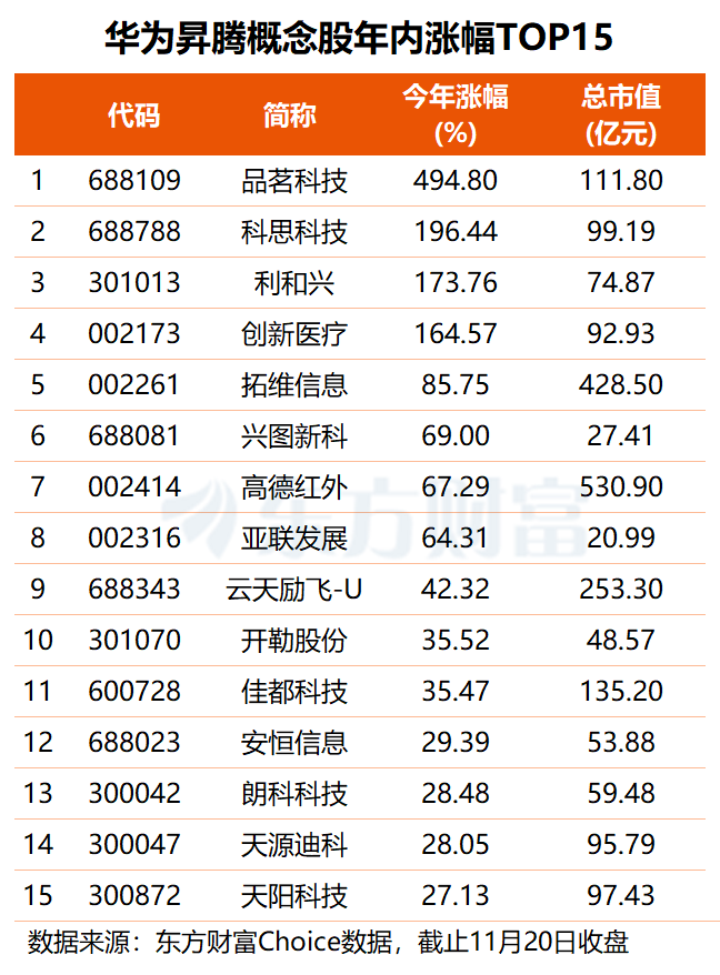 东方财富概念板块显示,目前A股市场共有41股涉及华为昇腾概念,合计总市值约5788亿元。华为昇腾概念股年内股价平均上涨40.35%,近八成个股实现上涨。其中,品茗科技、科思科技、利和兴等4股涨幅居前。品茗科技年内股价累计上涨约495%,公司系建筑行业软件龙头,此前曾携手华为发布联合解决方案。