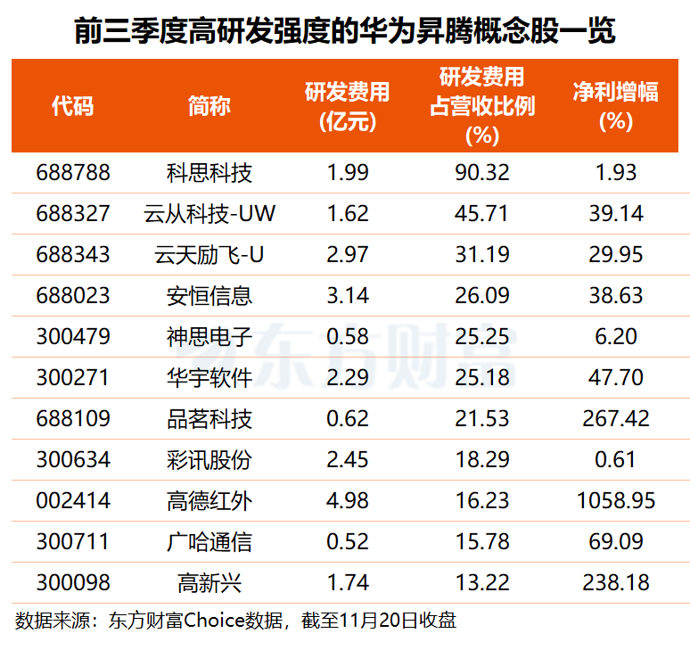 研发投入方面,东方财富Choice数据显示,今年前三季度研发费用超5000万元且净利润实现同比增长或好转的概念股共19只,其中,软通动力研发费用达7.71亿元居首,高德红外以4.98亿元的研发费用位居次席,安恒信息、云天励飞-U、彩讯股份等4股的研发费用均超2亿元。