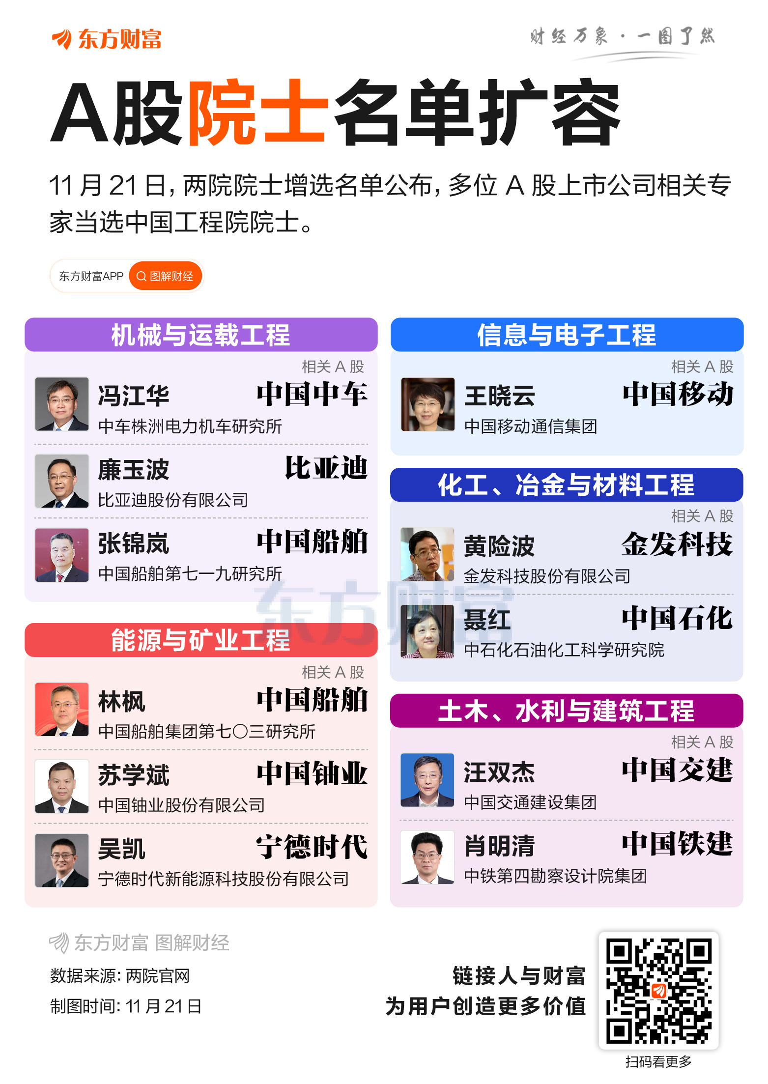 具体来看,比亚迪首席科学家廉玉波、宁德时代首席科学家吴凯、金发科技首席技术官黄险波、中国铀业(拟上市公司,11月21日新股申购)总工程师苏学斌、中国移动集团总工程师王晓云、中国石化集团首席专家聂红、中国交建首席专家汪双杰、中国铁建首席专家肖明清、中国中车首席科学家冯江华,以及中国船舶集团张锦岚、林枫等当选中国工程院院士。