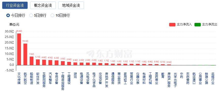 行业资金方面,截至收盘,文化传媒、航天航空、船舶制造等净流入排名靠前,其中文化传媒净流入28.39亿。