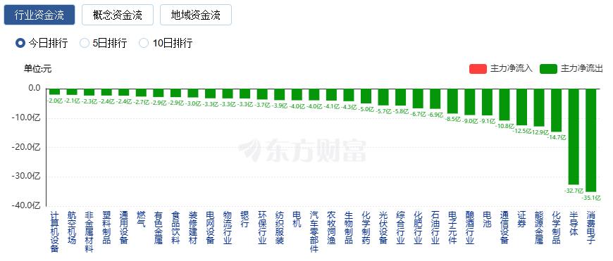 净流出方面,消费电子、半导体、化学制品等净流出排名靠前,其中消费电子净流出35.14亿元。