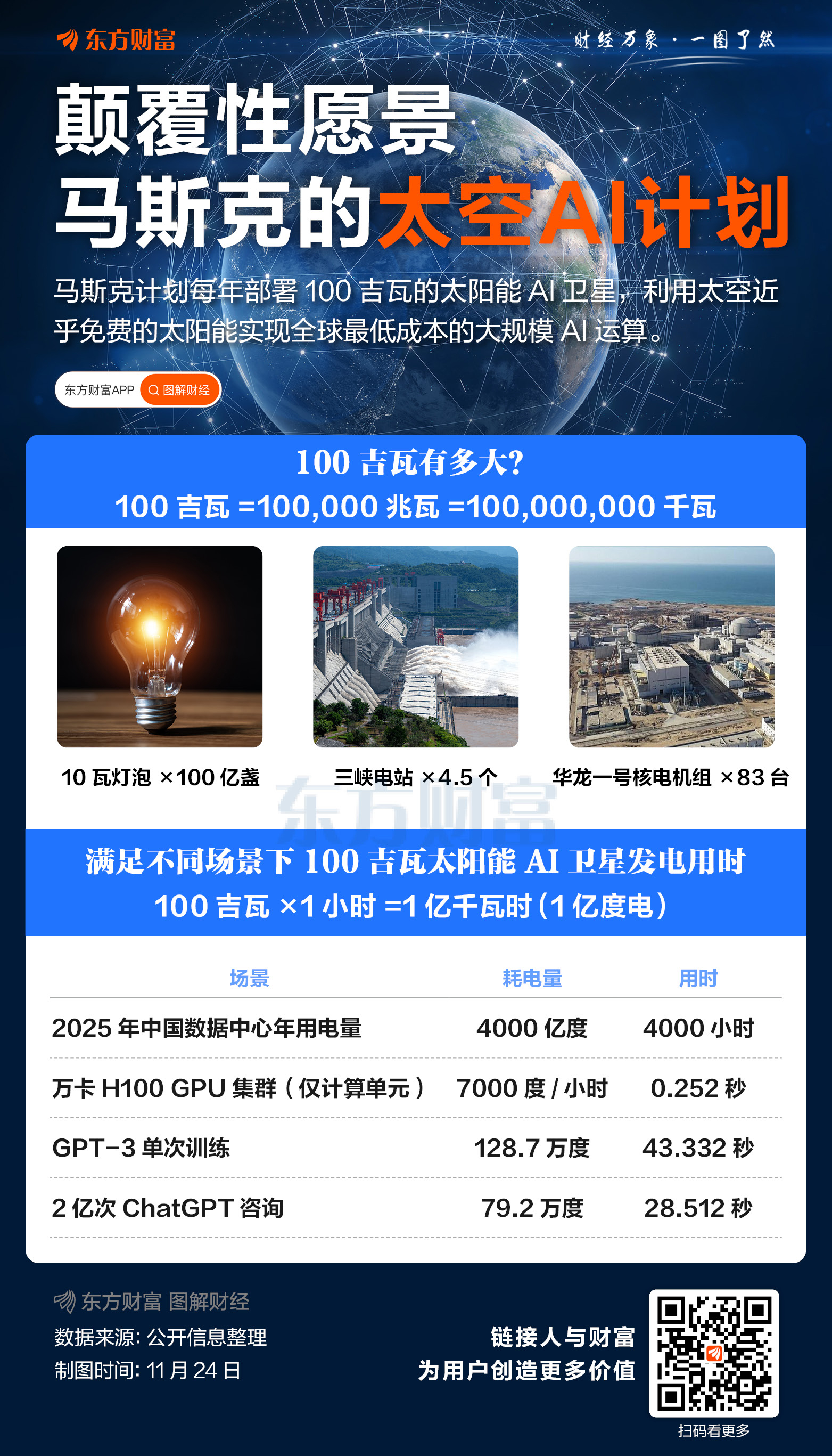 如果这个100吉瓦的系统满负荷运行1小时,它将产生1亿千瓦时(即1亿度)的电量。要满足2025年我国数据中心的用电需要发电4000小时;满足万卡H100 GPU集群(仅计算单元)1小时计算用电仅需0.252秒;满足GPT-3单次训练用时仅需43.332秒;满足2亿次ChatGPT咨询用电仅需28.512秒。