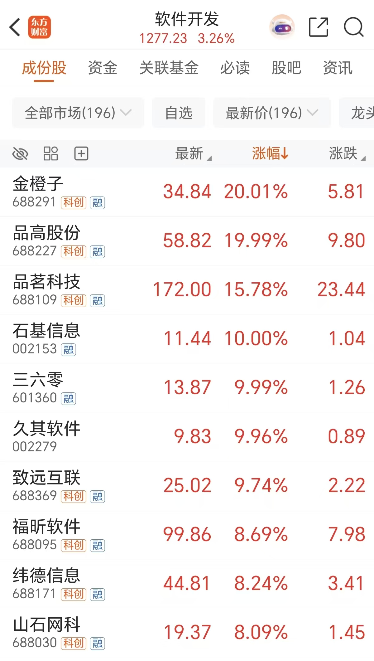 周一(11月24日)AI应用端软件概念股大爆发,金橙子、品高股份20CM涨停,石基信息、三六零、久其软件等多股涨停,致远互联、福昕软件等多股强势跟涨。