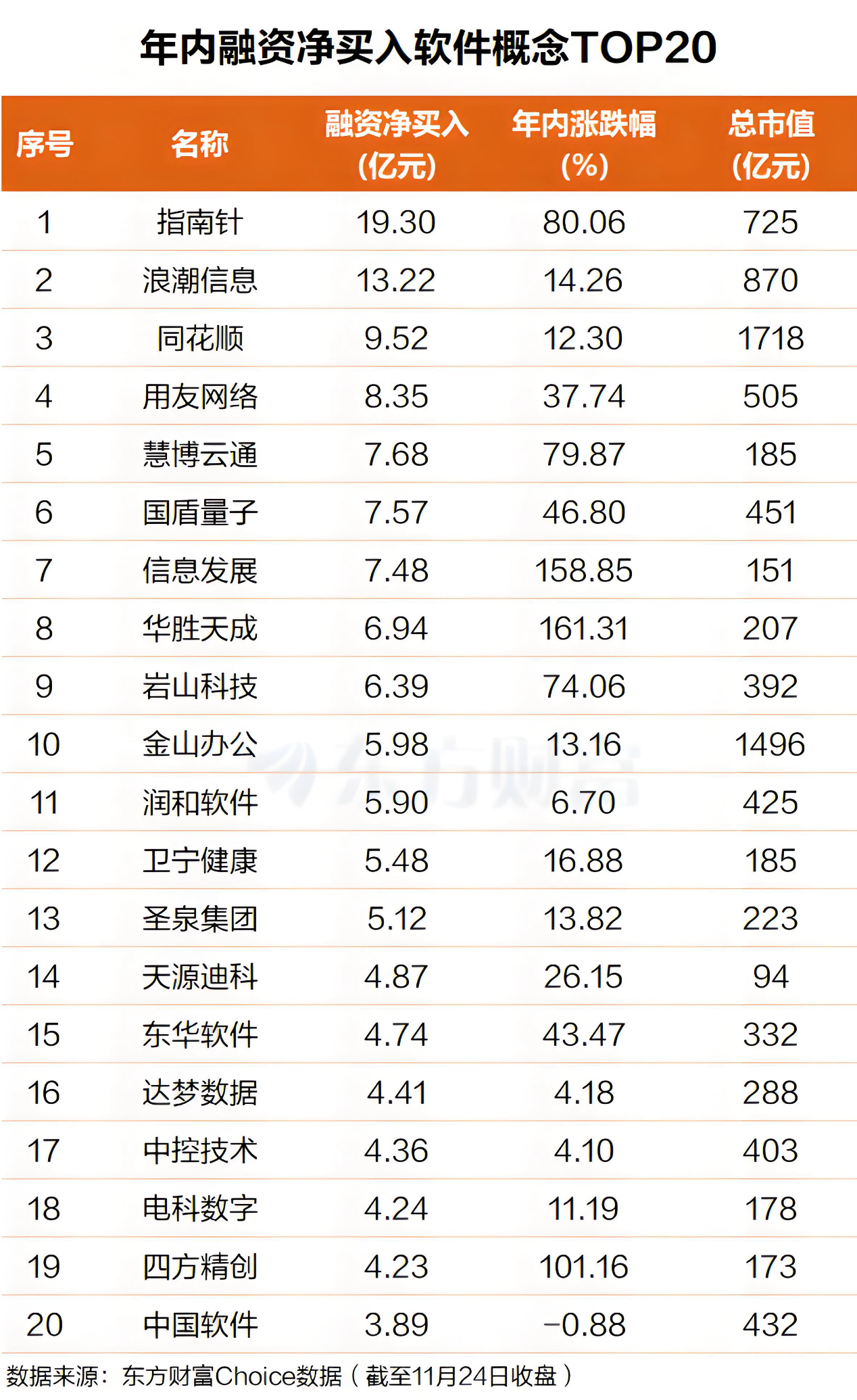 东方财富Choice数据显示,年内杠杆资金净买入多只国产AI应用端软件股,其中指南针排名第一,融资净买入超19亿元;浪潮信息排名第二,融资净买入超13亿元。