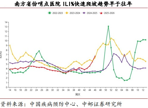 渤海证券研报数据显示,近期国内进入流感高发期,北方流感样病例占比达近4年新高,高于2022~2024年同期水平,建议关注体外诊断、疫苗、药店及相关制药企业的阶段性投资机遇。