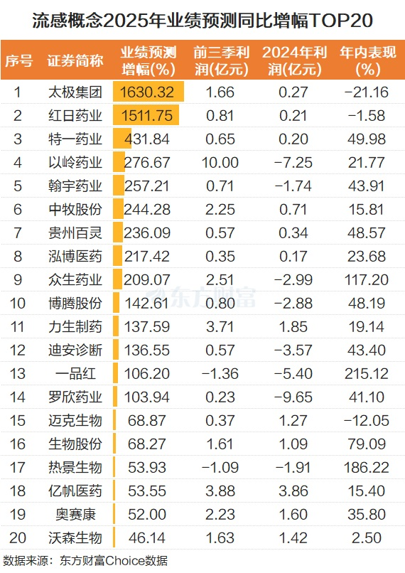 从股价表现来看,2025年业绩预测增幅前20个股中,截至11月25日收盘,一品红、热景生物、众生药业纷纷翻倍,涨幅为215.12%、186.22%和117.2%。特一药业、翰宇药业、贵州百灵、博腾股份、迪安诊断、生物股份等也涨幅靠前。