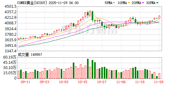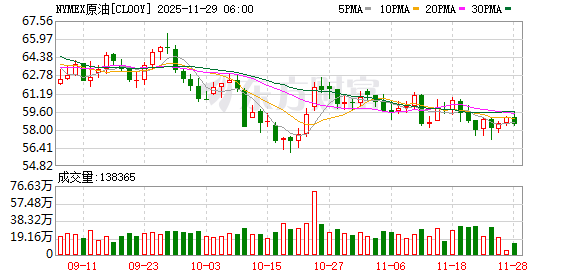 商品市场:国际油价11月24日上涨。截至当天收盘,纽约商品交易所WTI原油期货当月连续合约上涨0.83美元,收于每桶58.89美元,涨幅为1.43%。COMEX黄金期货当月连续合约上涨54.30美元,涨幅1.33%,报4133.8美元/盎司。
