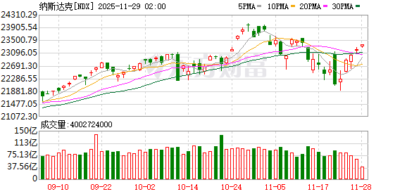 美股市场:美股三大指数11月24日收盘全线上涨。截至收盘,道琼斯工业平均指数比前一交易日上涨202.86点,收于46448.27点,涨幅为0.44%;标准普尔500种股票指数上涨102.13点,收于6705.12点,涨幅为1.55%;纳斯达克综合指数上涨598.93点,收于22872.01点,涨幅为2.69%。