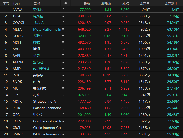 第11名英特尔收高10.19%,成交37.41亿美元。天风国际分析师郭明錤周五表示,预计英特尔将开始出货苹果公司最低端的M系列处理器,最早可能在2027年开始。郭明錤写道,他的行业调查“表明,英特尔成为苹果先进节点供应商的可见性近期显著提升”。