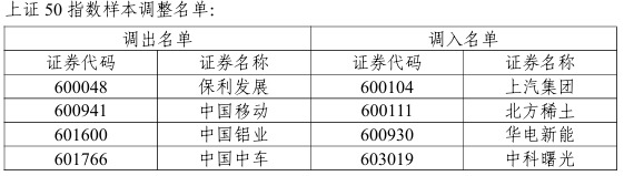 上证50指数更换4只样本,上汽集团、北方稀土、中科曙光等调入指数。