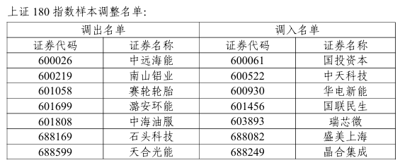 上证180指数更换7只样本,国投资本、中天科技、瑞芯微等调入指数。