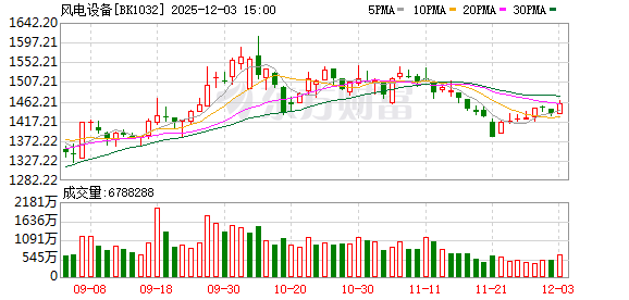 周三(12月3日)风电板块收盘逆势大涨1.6%。个股方面,中环海陆涨超11%,次新股德力佳涨停,300亿龙头大金重工午盘封上涨停,飞沃科技、金雷股份等跟涨。