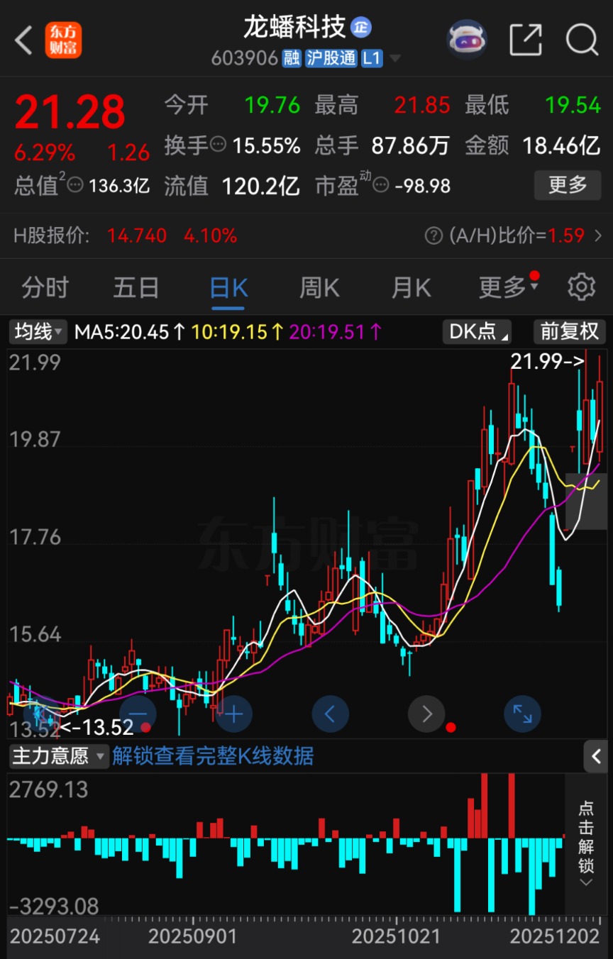 截至12月2日收盘,龙蟠科技股价报21.28元/股,涨幅达6.29%,总市值为136.3亿元。