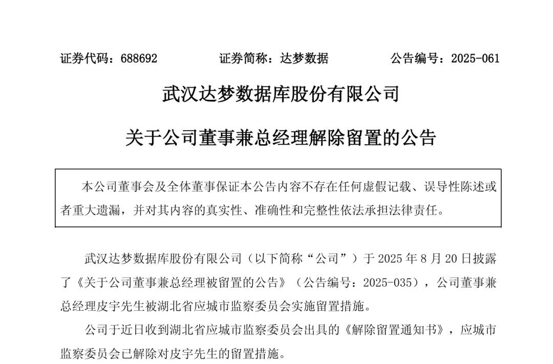 回溯来看,达梦数据于8月20日公告称,皮宇被湖北省应城市监察委员会实施留置措施。公司当时披露,皮宇近期未能亲自出席董事会会议,但已委托董事冯裕才代为行使表决权。