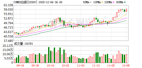 商品市场:国际油价12月05日上涨。截至当天收盘,纽约商品交易所WTI原油期货当月连续合约上涨0.47美元,收于每桶60.14美元,涨幅为0.79%。COMEX黄金期货当月连续合约下跌15.30美元,跌幅0.36%,报4227.7美元/盎司。周五纽约尾盘,现货白银涨2.08%,报58.3240美元/盎司,盘中涨至59.3336美元创历史新高,本周累涨超3%。COMEX白银期货涨2.28%,报58.8美元/盎司,盘中涨至59.900美元创盘中历史新高,本周累涨近3%。