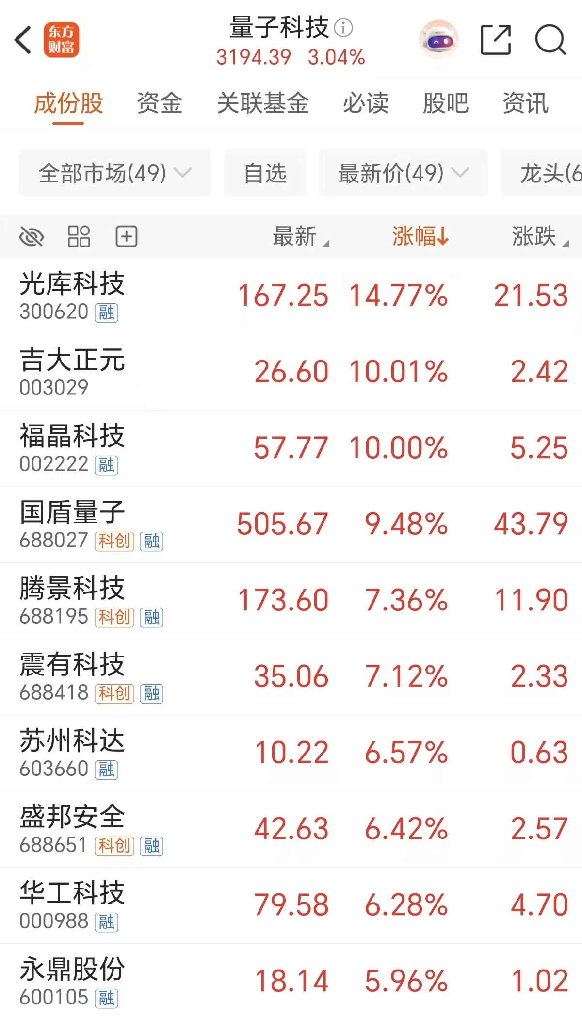 周一量子科技概念收盘大涨超3%,光库科技大涨近15%,吉大正元、福晶科技等涨停,国盾量子涨超9%。