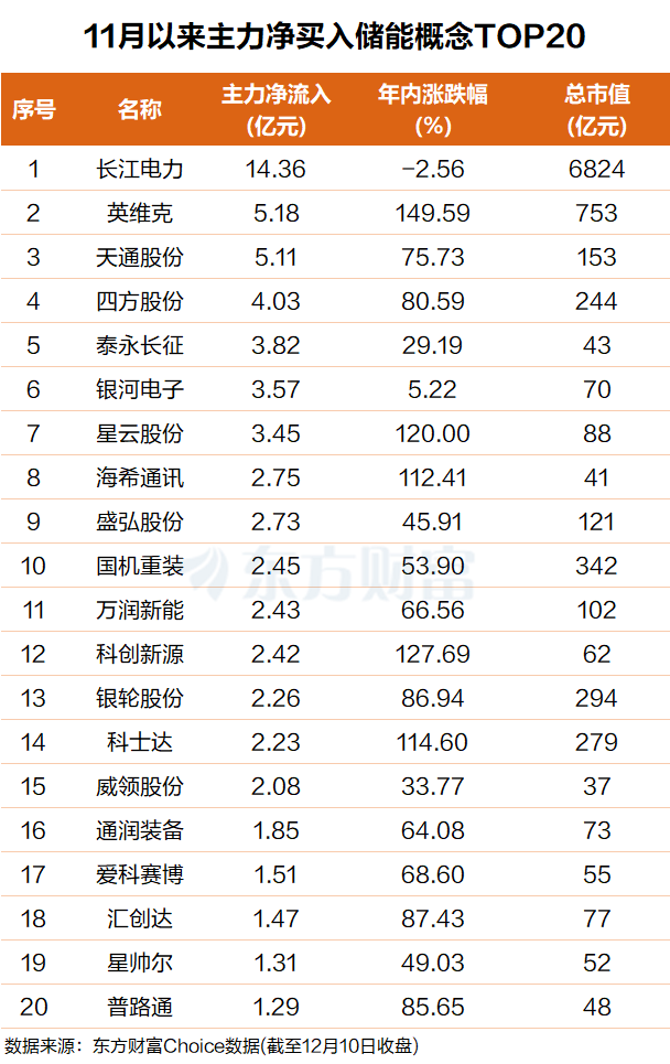 东方财富Choice数据显示,自今年11月以来,主力资金抢筹了一批储能概念股,净买额前20个股合计超66亿元。