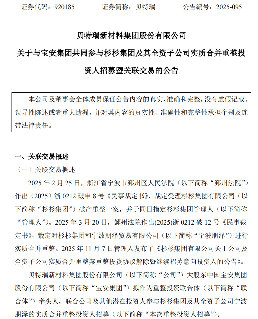 中国宝安(000009)12月12日晚间公告,公司于2025年12月12日召开了第十五届董事局第七次会议,审议通过了《关于参与杉杉集团及其全资子公司实质合并重整投资人招募的议案》,同意公司作为重整投资联合体牵头人,联合下属子公司贝特瑞及其他潜在投资人参与杉杉集团有限公司(简称“杉杉集团”)及其全资子公司宁波朋泽的实质合并重整投资人招募。