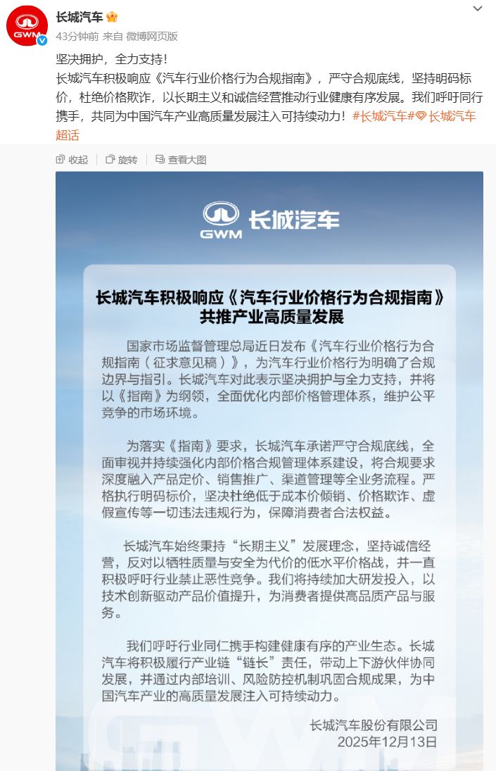 同日,长城汽车发文称,积极响应《汽车行业价格行为合规指南》,严守合规底线,坚持明码标价,杜绝价格欺诈,以长期主义和诚信经营推动行业健康有序发展。长城汽车承诺严守合规底线,全面审视并持续强化内部价格合规管理体系建设,将合规要求深度融入产品定价、销售推广,渠道管理等全业务流程。严格执行明码标价,坚决杜绝低于成本价倾销、价格欺诈、虚假宣传等一切违法违规行为,保障消费者合法权益。
