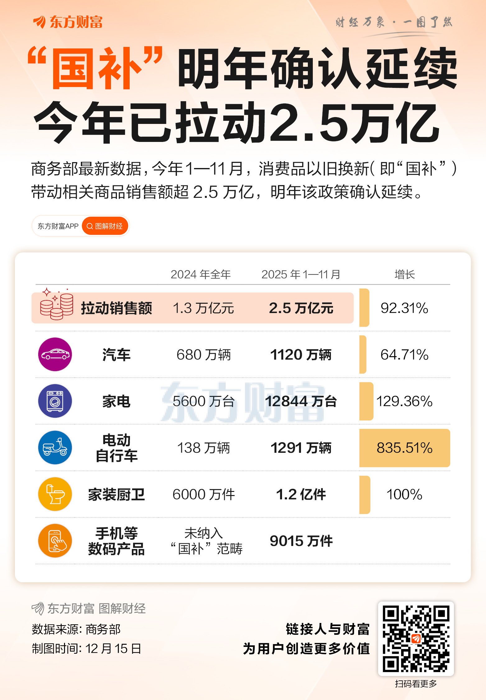 商务部最新数据显示,今年1—11月,消费品以旧换新(即“国补”)带动相关商品销售额超2.5万亿元,惠及超3.6亿人次。对比2024年,“国补”带动相关产品销售额超过1.3万亿元的成绩单,可谓成效显著。其中,汽车以旧换新超1120万辆,家电以旧换新超12844万台,手机等数码产品购新补贴超9015万件,电动自行车以旧换新超1291万辆,家装厨卫“焕新”超1.2亿件。