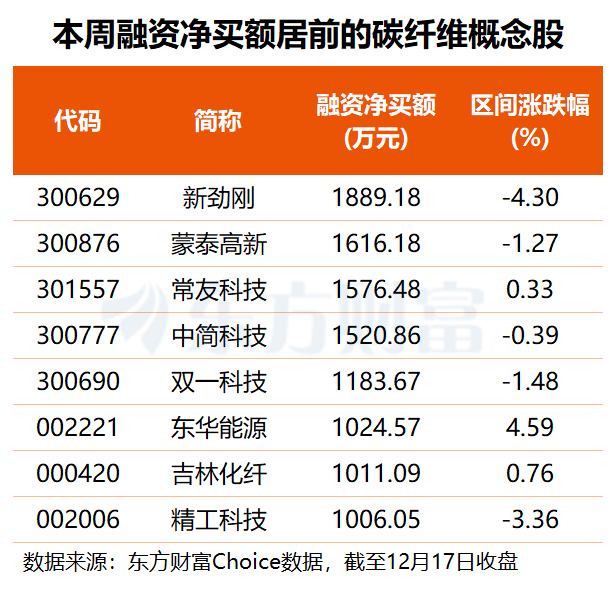 东方财富Choice数据显示,本周以来,共有15只碳纤维概念股获融资净买入,其中8股净买额规模超千万元,新劲刚获融资客抢筹1889万元,蒙泰高新、常友科技分别获1616万和1576万元融资净买入。