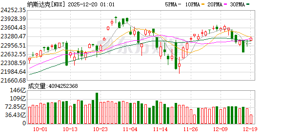 美股市场:美股三大指数12月18日收盘全线上涨。截至收盘,道琼斯工业平均指数比前一交易日上涨65.88点,收于47951.85点,涨幅为0.14%;标准普尔500种股票指数上涨53.33点,收于6774.76点,涨幅为0.79%;纳斯达克综合指数上涨313.04点,收于23006.36点,涨幅为1.38%。